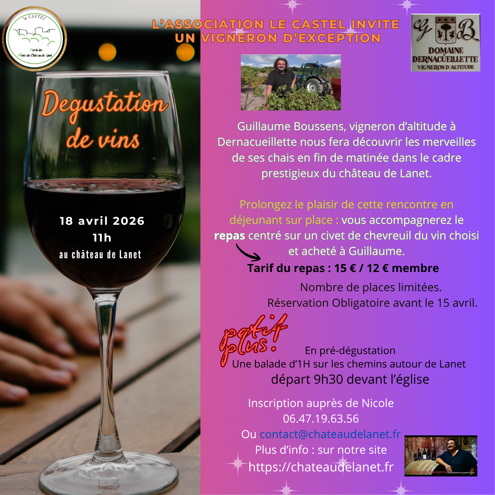 Guillaume nous fait le grand plaisir de venir au château de Lanet parler de son terroir aux caractéristiques uniques, de sa vie de vigneron engagé au service de l’excellence, de ses vins qu’il sait nous faire découvrir dans les meilleures conditions.