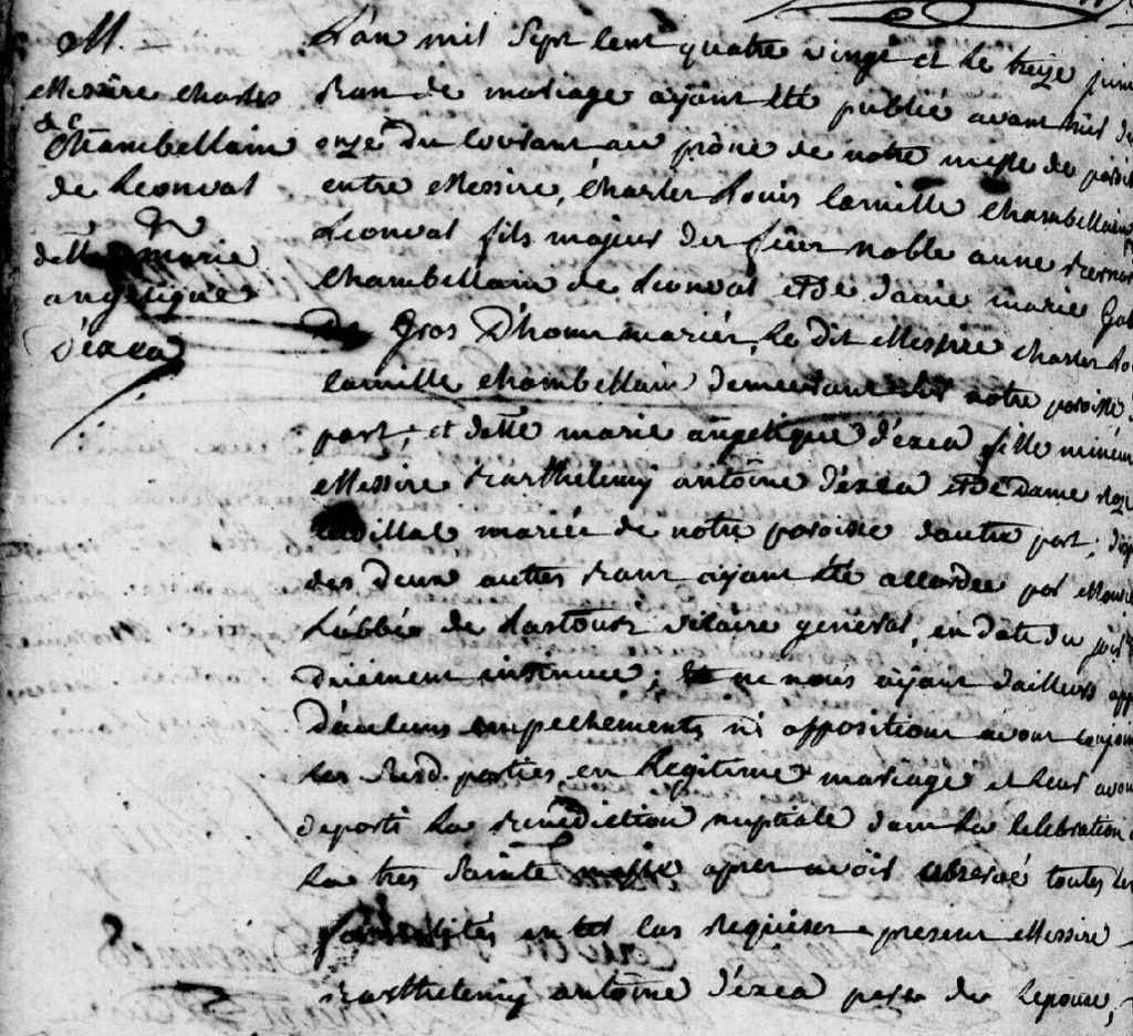 Contrat de mariage en date du 12 juin 1780 déposé chez Pierre Maupel notaire à Narbonne. Charles Louis Camille y est qualifié d’écuyer.