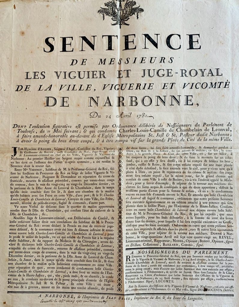 Jean-Hyacinthe d’Augier, seigneur d’Agel, Conseiller du Roi, Viguier; et Guillaume de Revel, aussi Conseiller du Roi, Juge-Royal civil et Lieutenant criminel en chef en ses villes, viguerie et vicomté de Narbonne : au premier Huissier ou Sergent requis comme ce jourd’hui et en bas écrit en l’instance des Parties ci-après nommées, a été rendue la Sentence dont la teneur suit. Entre Me Viennet, substitut de M. le Procureur général du Roi, faisant les fonctions de procureur du roi au siège de ladite viguerie et vicomté de Narbonne, plaignant et demandeur en réparation du crime de fratricide, meurtre et assassinat prémédité, commis par trente- deux coups de couteau, dans la nuit du vingt-cinq au vingt-six décembre dernier, en la personne de la Damoiselle Anne de Leonval de Chambellain, dans le temps qu’elle étoit couchée dans son lit, et dans une chambre de la maison qu’elle habitoit avec son frère en cette ville, d’une part; et le Sr Charles-Louis-Camille de Chainbellain de Leonval, citoyen de cette ville, son frère, accusé, décrété de prise-de-corps, fugitif et contumax, d’autre part………