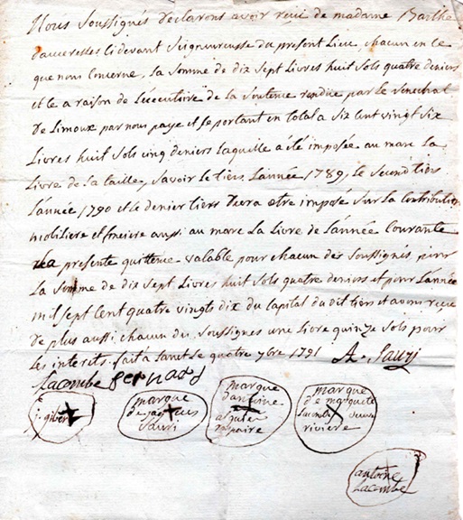 Le 4 septembre de la même année, soit quelques jours avant la signature de cet accord, les différents membres de la communauté avaient reçu chacun quittance de la seigneuresse de Lanet de la somme de 17 livres 8 sols 4 deniers à déduire de celle de 626 livres 8 sols 5 deniers à laquelle ils avaient été condamnés collectivement.