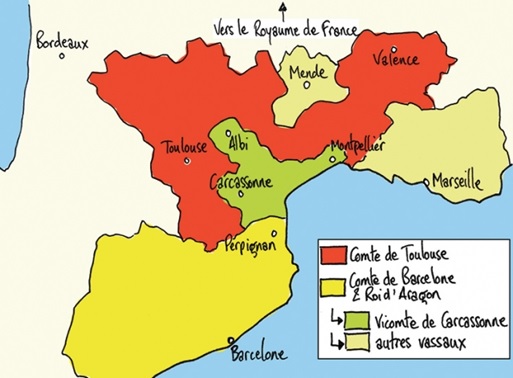 La cible de la croisade repose sur trois têtes : le comte de Toulouse, Raymond VI, accusé d’avoir commandité l’assassinat du légat du pape en 1208, Pierre II roi d’Aragon et comte de Barcelone et Raimond-Roger Trencavel, vicomte de Carcassonne, Béziers et Albi. Pour simplifier ( ?) gardez présent à l’esprit que Pierre II et Raymond VI sont beaux-frères, que Trencavel est neveu du comte de Toulouse et vassal du roi d’Aragon lui-même vassal du pape alors que Toulouse est vassal du roi de France. Vous suivez ?
